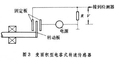 电容式传感器,有面积变化型和介质变化型两种。图3中是面积变化型的原理,图中电容式转速传感器由两块固定金属板和与转动轴相连的可动金属板构成。可动金属板处于电容量最大的位置,当转动轴旋转180°时则处于电容量最小的位置。电容量的周期变化速率即为转速。可通过直流激励、交流激励和用可变电容构成振荡器的振荡槽路等方式得到转速的测量信号。介质变化型是在电容器的两个固定电极板之间嵌入一块高介电常数的可动板而构成的。可动介质板与转动轴相连,随着转动轴的旋转,电容器板间的介电常数发生周期性变化而引起电容量的周期性变化,其速率等于转动轴的转速。