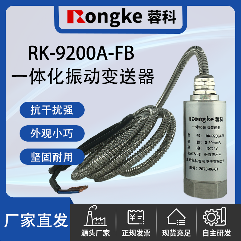 RongKe蓉科/ 一体化振动变送器将磁电式振动传感器、精密测量电路集成在一起,构成高精度振动测量系统,该变送器可直接连接DCS、PLC或其它设备,是测量风机、动机、水泵等工厂设备振动的理想选择。