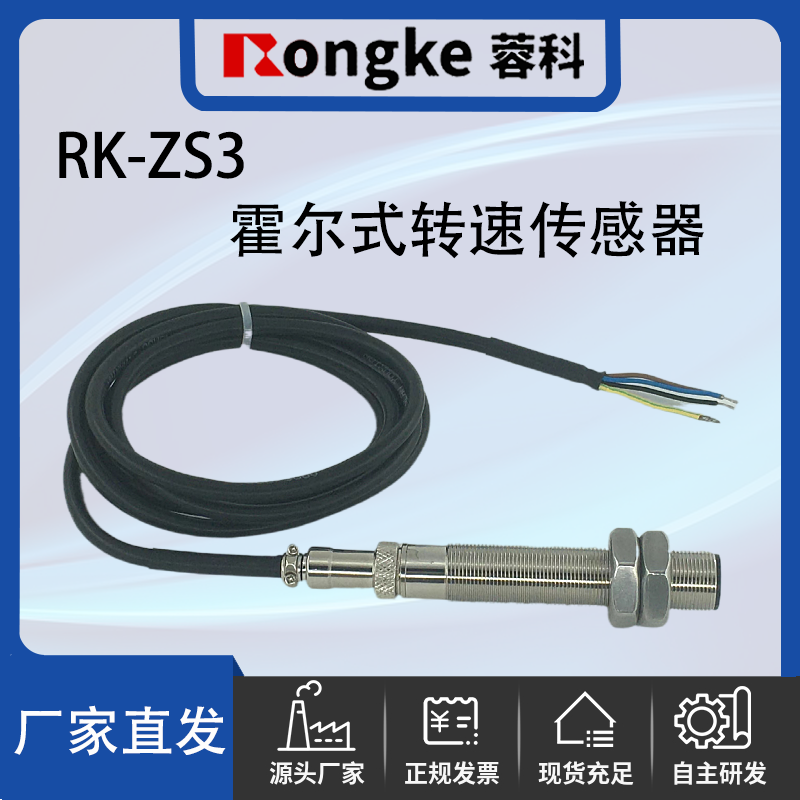 RK蓉科-ZS3霍尔式转速传感器 由磁敏电阻作感应元件,是一种新型的转速传感器。当被测体上带有凸起(或凹陷)的磁性或导磁材料,随着被测物体转动时,传感器输出与旋转频率相关的脉冲信号,达到测速或位移检测的发讯目的。