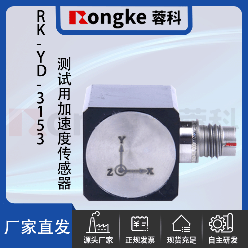 RK-YD-3153测试用加速度传感器 特点:微型轻量、1/4-28四芯小插座输出X、Y、Z 三向输出频响宽、结构测试1mV/g,可选2-5mV/g, ±5,000 g...